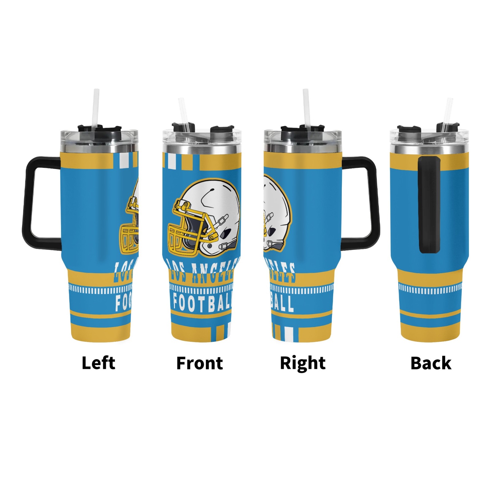 This football-themed tumbler features a Los Angeles-inspired sports design with a clean and balanced appearance. The exterior design includes football elements without excessive graphics. This allows the tumbler to fit into professional and casual environments. The visual style remains suitable for shared spaces.
