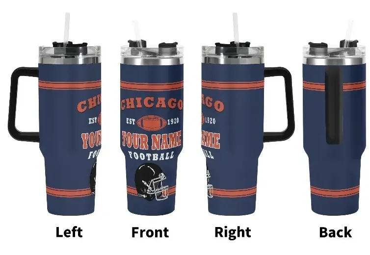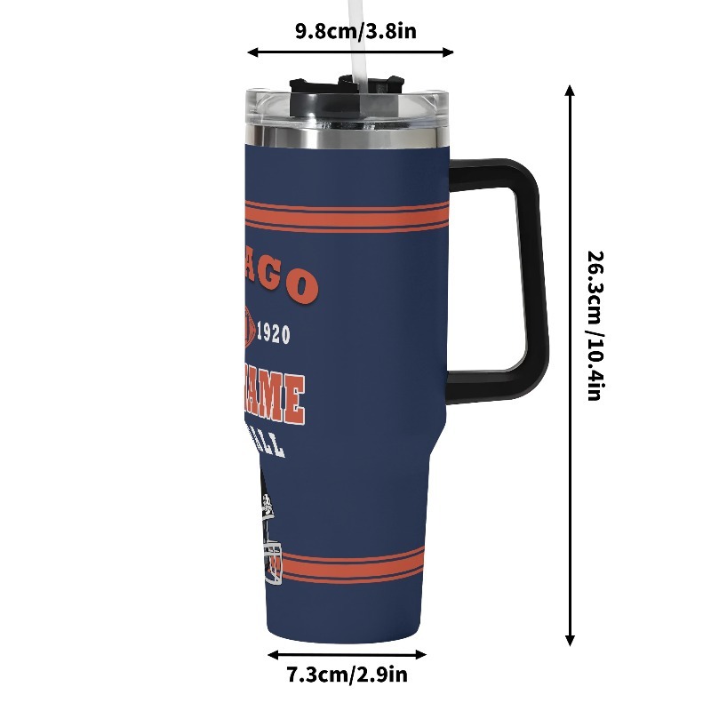The Custom Chicago Football Tumbler brings together design, travel utility, and long-use materials in one dependable format. Featuring a wide structure, handle, lid, and straw, this drink cup transitions smoothly from weekday to weekend.