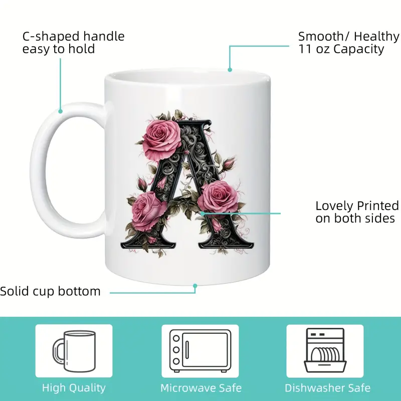 Made from ceramic, it offers dependable use and a refined appearance. The surface remains smooth, and the balanced structure ensures it sits securely on any surface. With its carefully designed floral letters, this mug suits both home and workplace settings, offering a touch of style and individuality in every use.