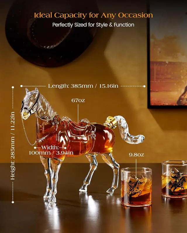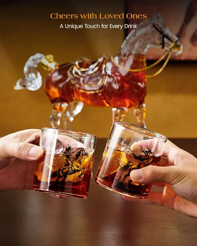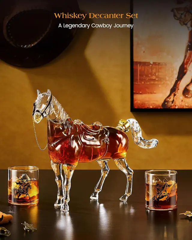 The Horse Shaped Cowboy Glass Set stands out through its sculpted design and coordinated western theme. Rather than focusing solely on function, this set emphasizes presentation and atmosphere. The horse-shaped decanter serves as both a vessel and a decorative centerpiece, while the matching glasses complete the visual story.