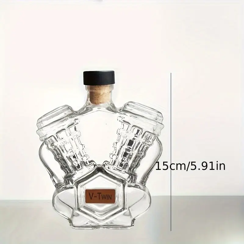 The Motorcycle Engine Shaped Wine And Whiskey Decanter is a creative 10.14oz mini liquor bottle shaped like a motorcycle engine. Crafted from glass, it offers both functionality and decorative flair. Whether used to pour whiskey or displayed as part of a bar setup, it adds one-of-a-kind character to any environment.