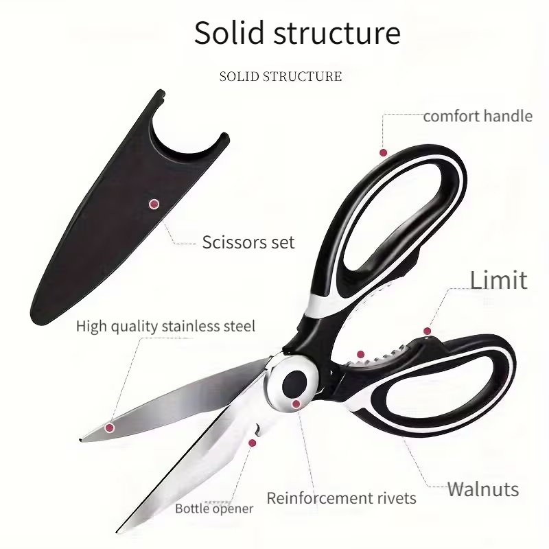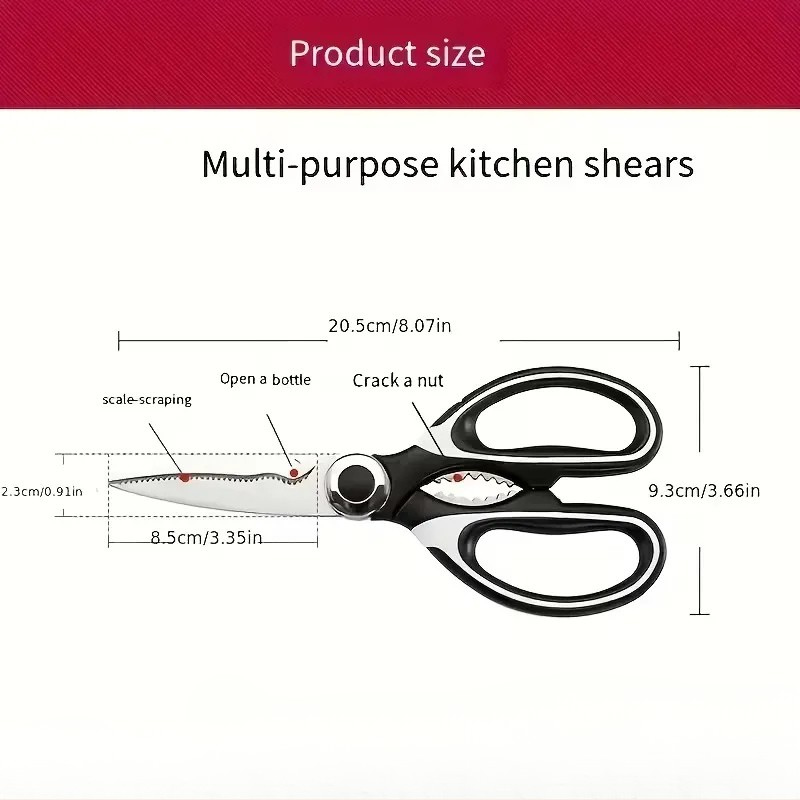 These kitchen scissors combine versatility and practicality in one tool. With stainless steel construction and a comfortable grip design, they are suitable for various kitchen tasks. From cutting meat to preparing ingredients for cooking or BBQ, this tool simplifies food preparation while maintaining efficiency and ease of use.