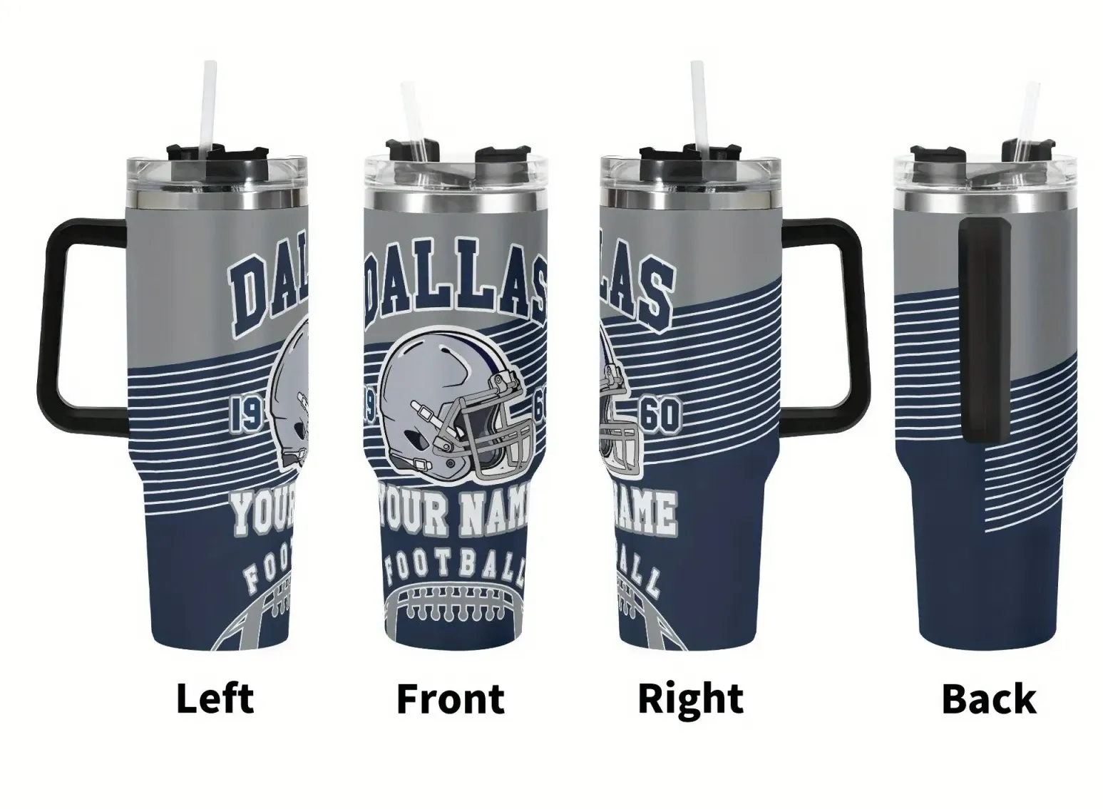 This Personalized Dallas Cowboys football-themed tumbler fits well within personalized merchandise catalogs, sports-inspired collections, and everyday lifestyle product ranges. Its neutral design approach ensures flexibility for both personal buyers and sellers seeking customizable hydration solutions without reliance on licensed imagery or branding.
