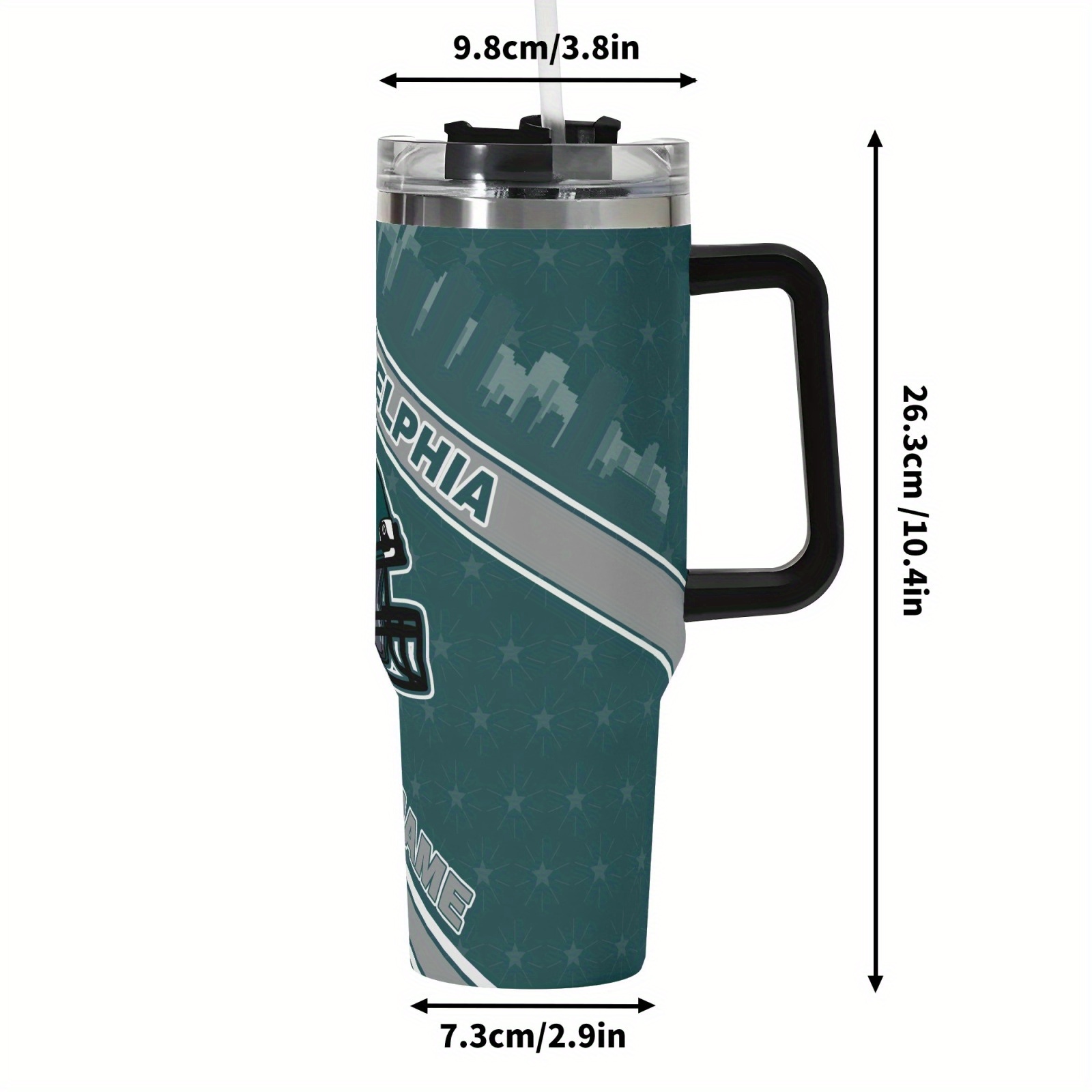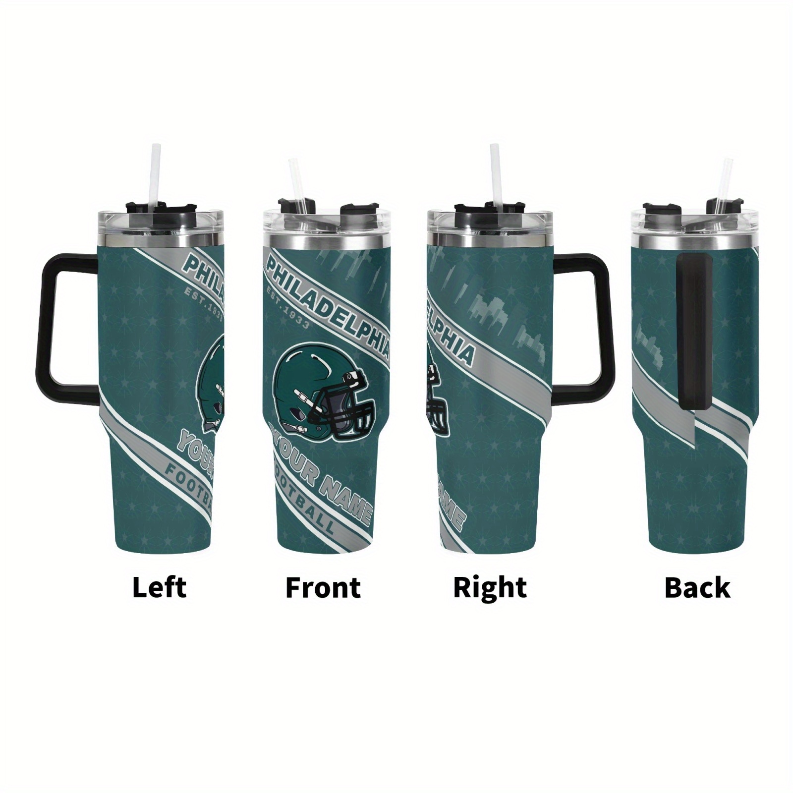 Philadelphia Football Travel Mug is a 40-oz insulated travel mug designed for daily drink routines and football-themed events. The themed wrap design stays visible from multiple angles, matching how the product is displayed in the listing images. With a side handle, fitted lid, and straw included, it supports commuting, desk use, school schedules, travel routines, and fan gatherings.